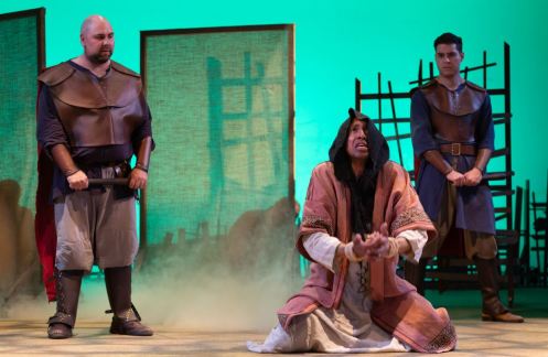 David Hovatter’s supercilious hardened military man, Gaius Suetonius, is haughtily contemptuous of the British as a people. Indeed, the portrayal of the British kings veers dangerous close to they looking like lager louts, who are almost egged-on by Catus Deciamus, Procurator of Britain, a double-dealer, slickly played by Darren Chancey. Badvoc, played with gusto by David Erdos, for example, comes across as a pugnacious neanderthal. However, Antony Curran’s Cunobeline, is more circumspect and realistic, in a suitable underplayed depiction of a king whose sense of nationhood is tempered by understanding of what is possible.