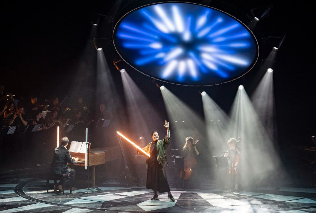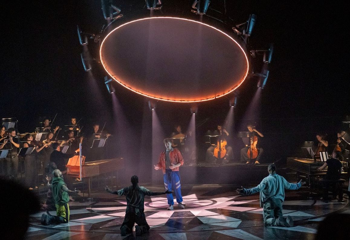 In a production with huge visual appeal, García-Alarcón and the Cappella Mediterranea, electrify the musical appeal of Rameau’s score, adding the visual bonus whenever they reappear from the gloom behind the sunshine of the disc dominated dancers’ stage, with rarely seen period instruments, including many unusual, in the 21st Century, stringed instruments. And we may often see a theorbo in a baroque orchestra, occasionally valveless trumpets, but it is rare to see a musette de cour, the bellows-blown bagpipe of Rameau’s time, with its unique shuttle drones, played with aplomb by Patrick Blanc.