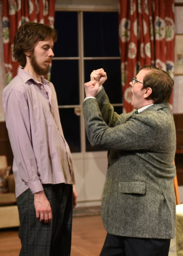 Mia Biagio plays the “fragile” Sarah, whose first act is to adjust and straighten all the cutlery and ornaments on set. In both her delivery and through her colourful wardrobe from Sarah Andrews, Mia perfectly and apparently effortlessly channels the queen of 1970s sophistication, Penelope Keith, who of course originated the role.