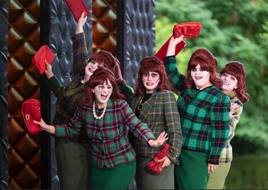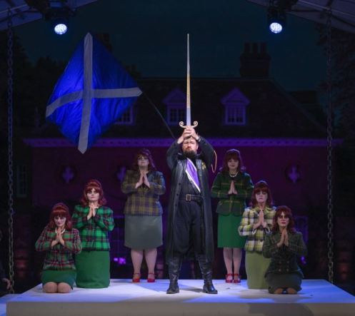 After the minor mode musical prelude, which gives a taste of what is to come especially the grand scena di sonnambulismo, we meet the witches, a half dozen formidable females, that make you sit up in your seat. They are a burlesque, designed to catch you off-guard. With narrow skirts and pinched-waist jackets in colourful tartan tweeds, and bright red hair, these lasses are robustly Celtic. Blood-red tears streaked across their faces are unsettlingly sinister.