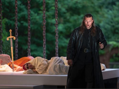 Jean-Kristof Bouton as Macbeth and Simon Wilding playing Banquo create a powerful presence that has immediate impact. We are treated to them in full flow right from the returning battle victors’ fateful meeting with the witches, in the La mano rapace non alzerò duet in which Macbeth ironically promises never to raise a predatory hand to seize the throne.