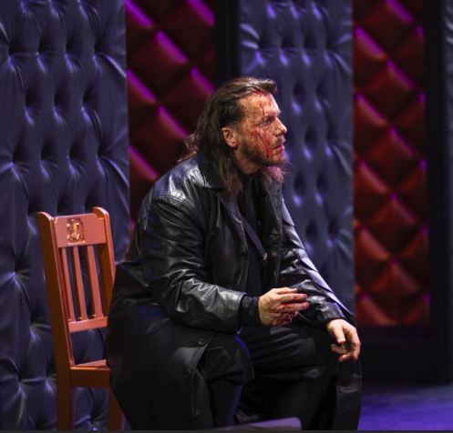 The chorus’ most touching scene as displaced Scottish refugees stream across the English border, is enacted with measured pathos, as the sing in unison for their oppressed homeland, patria oppressa. As they sing of the deprivations visited on them by war, one is brought up with a jolt, thinking of our present world. These could be Ukrainians or many other persecuted peoples. Amongst them is Macduff, the Thane of Fife, whose wife and children have been freshly slaughtered by Macbeth’s squad of assassins. Robyn Lyn Evans is tragically magnificent as the bereft Macduff. His solo Ah, la paterna mano, non vi fu scudo, o cari, lamenting that his fatherly hand was not there to shield his loved ones, is the only tenor aria in the whole opera, and Evans imbues it with a deep anguished intensity. It is Macduff who finally puts and end to Macbeth, in single-handed combat. There is a very poignant touch, as Macduff kisses the pictures of his wife and children before letting them fluttter down onto the body of the vanquished tyrant.