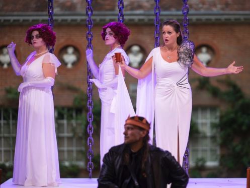 The thought-provoking design, by Studer, and cleverly lit by the ever-inventive Sarah Dell, is set against the facade of West Green House (perhaps too finely-chiselled to be a Scottish ancestral pile), which is seen through the open wall of the Green Theatre, where rows of chains hang. Chains confine, but as the plot progresses most are removed, for chains can also pull, and chains can anchor, as the Macbeth couple become more and more morally adrift. Around a central dais are tall purple and black cabinets. These can represent walls in the castle, or niches for assassins to hide, or spy rooms for the Doctor to observe Lady Macbeth’s mental disintegration. However, they are lined in stuffed and deep-buttoned satin, padded cells perhaps, or looking again, spiky iron maidens to crush dissent.
