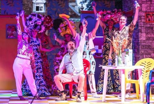 The colourful set, conceived by Studer, is full of witty references to place it in New South Wales in the 1970’s, and is complemented by brilliantly researched costumes by Jill Rolfe and her team, including cricket shirts hinting at the Australian national squad of that time, plus tee-shirts with racy slogans, and bell-bottomed zany body suits for Pasquale’s indolent servants. The latter also have ultra-flamboyant floral headwear, by Ben Johnson-Rolfe, to complete the exuberance of their get-up, sort-of blossom possums.