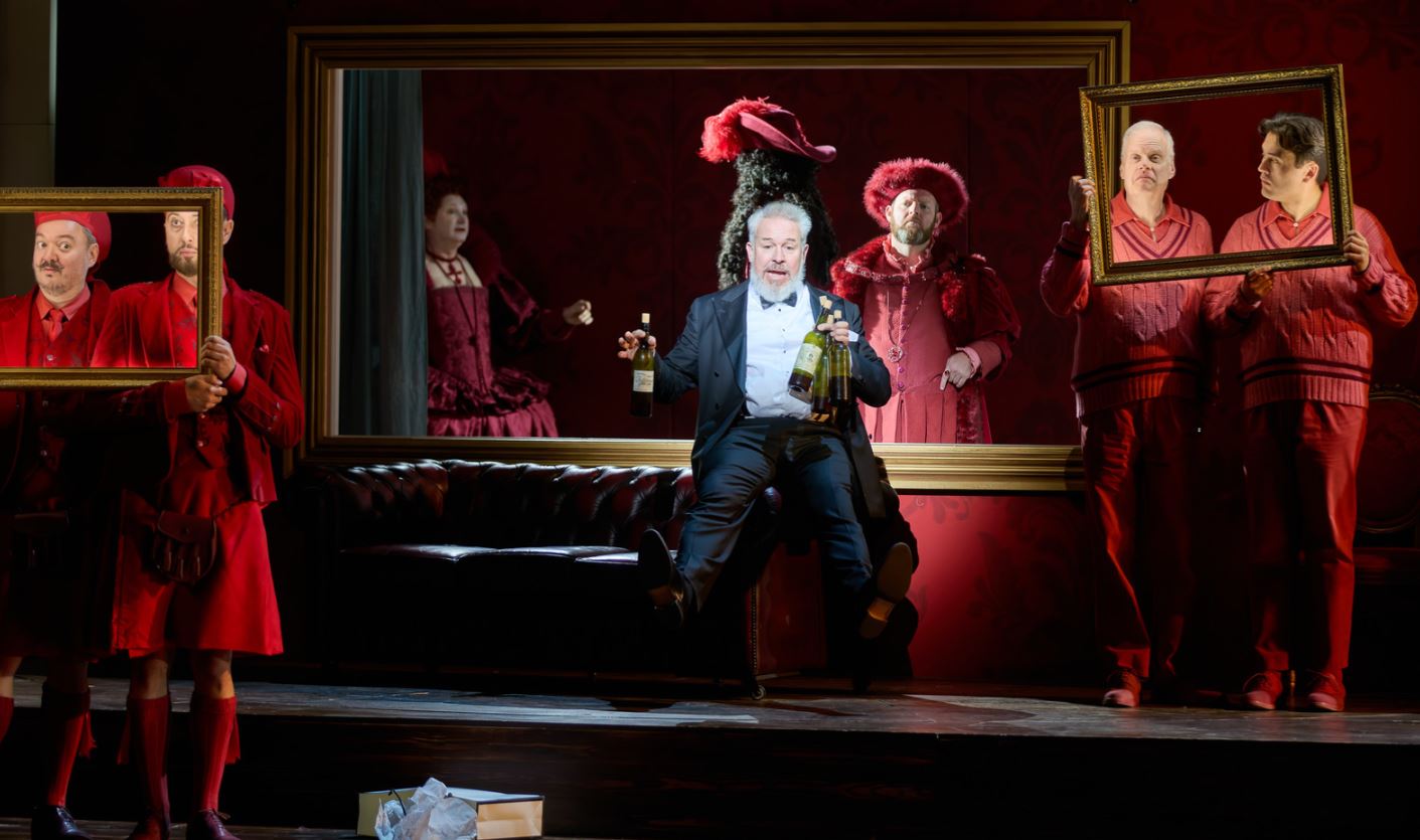 The opera is directed by Julia Burbach and I thought she had learnt a lot from her mentor Christof Loy. It’s an intelligent colourful, fun interpretation, busy but not fussy, tasteful and funny without being coarse. The production and the sets, both in concept and execution, are excellent. The characters are all “colour coded”, and there is a set of ancestral cross-dressing ghosts, mainly royal figures from the past, to help the action along. There are children dressed as mice and colour changes of the wallpaper to signify changes in location that all fits together well. There is only one set, a two storied modern house, which has two revolving rooms on the ground floor to add variety and interest. The choreography adds to the fun, slightly over the top as it should be for this Rossini entertainment. The orchestra led by Yi-Chen Lin proves to be on good form and is generally light on it’s feet, so providing effervescent foundation for the comedy.