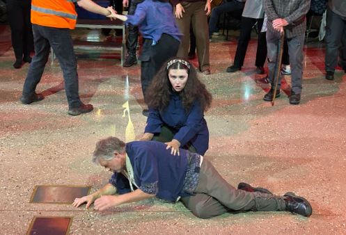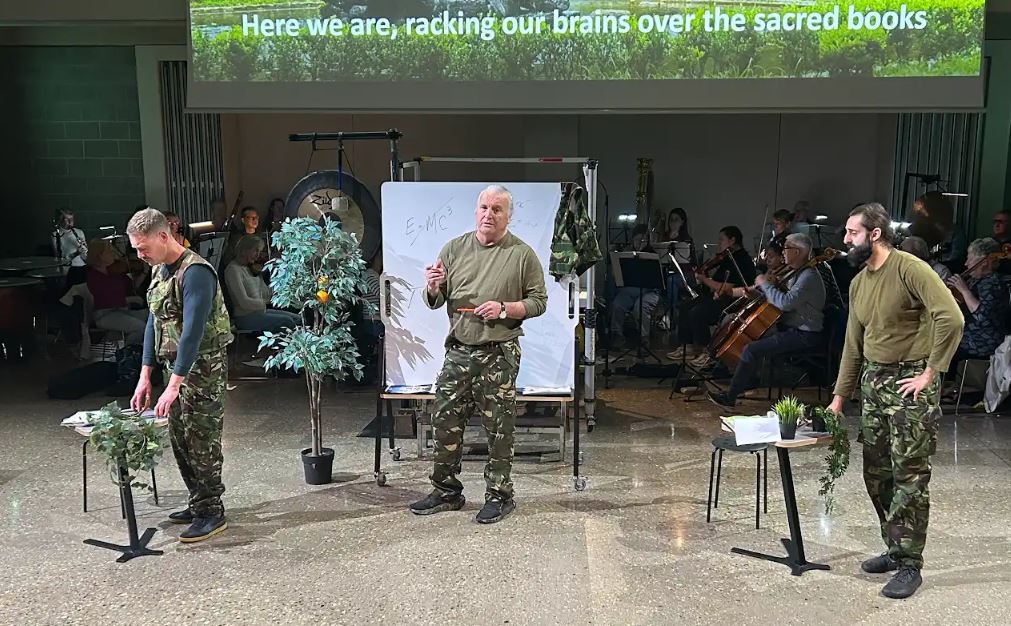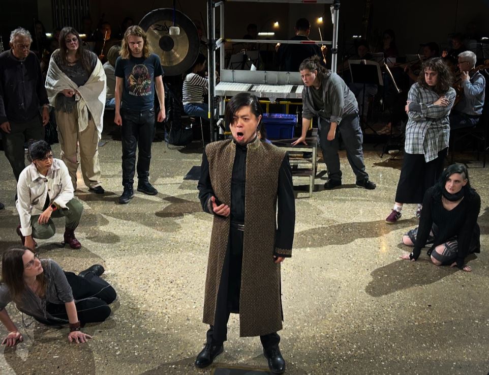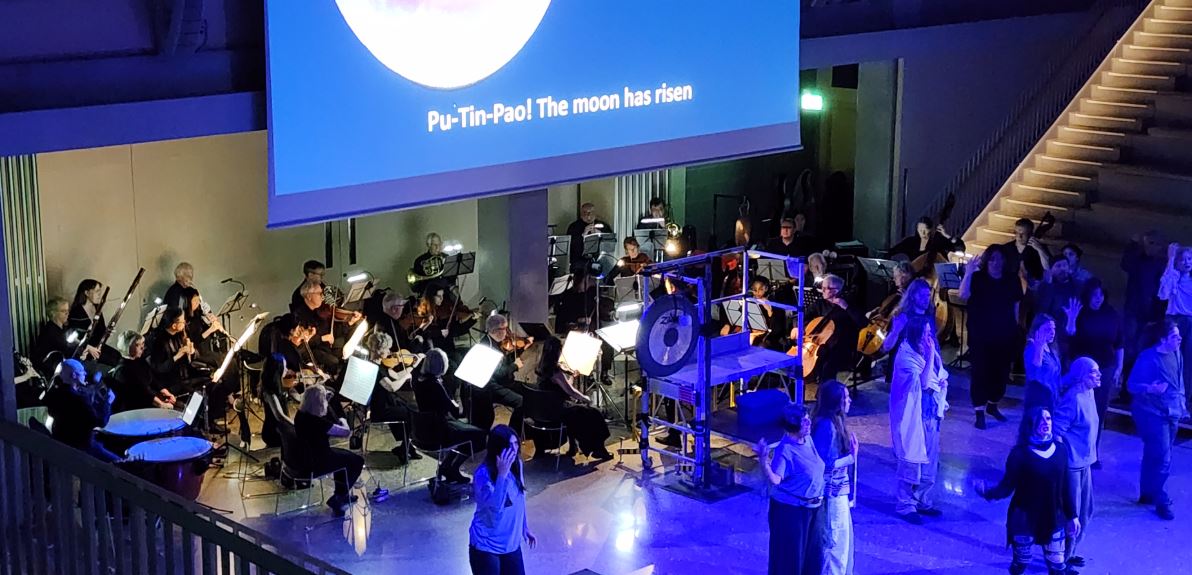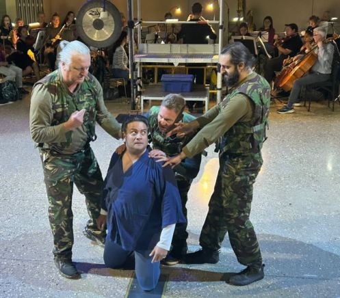 Instant Opera revived its ambitious production, sung in Italian, of Puccini’s final (unfinished) opera, Turandot, in a new venue, designed by Grafton Architects, which has won several prestigious architectural awards for its clean and open format. The Courtyard, an auditorium in the Town House at Kingston University, offers a large performance space for the chorus and soloists, especially with the 38-piece orchestra behind the acting area. The steeply stepped arena with hard seating on three sides gave excellent sightlines and clear surtitles were projected onto a large screen, together with images of the moon and various backgrounds, including devastated cities. Writing in the programme, Instant Opera’s artistic director and producer, Nicholas George explained his concept of a post-apocalyptic dystopian society set in 2184,. This imagined a cruel, medieval type society not dissimilar to the original Gozzi Chinese setting. The first difference I noticed was the comedia del arte trio of ministers being in paramilitary costume.