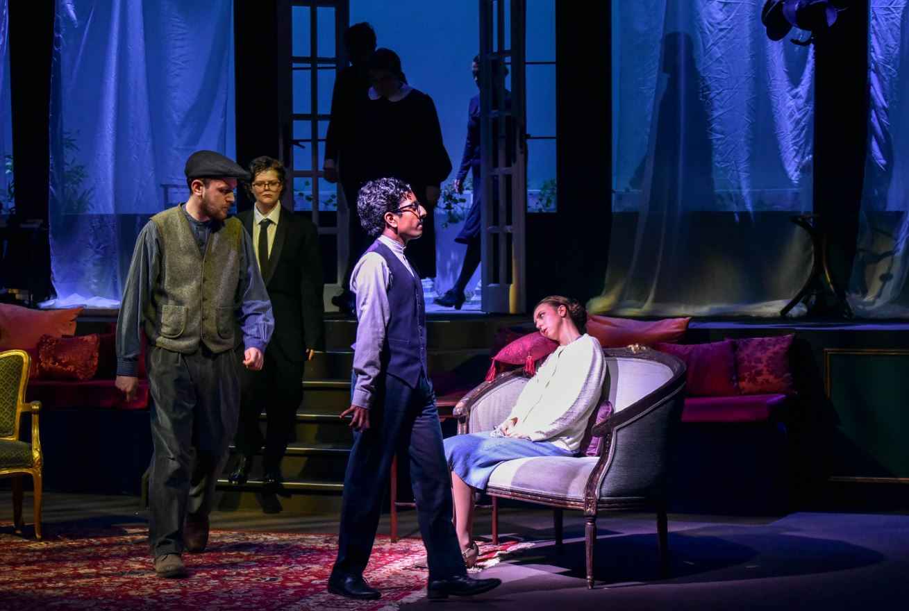 In this classic Agatha Christie play put on by the polished YAT company, we encountered an authentic set of a thirties living room, and a generous-looking cocktail cabinet. The backdrop of French doors opening onto a balustrade and sea view were cleverly gauzed, immediately setting the scene, a small island off the Devon coast, isolated of course in true Christie style.