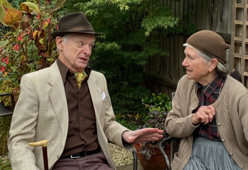 To begin with, a simple garden set with a white metal table and two matching chairs, aided by back projection of moving clouds. Enter two trilby-hatted gentlemen, elderly and elegant, who engage in casual conversation. Seemingly just a couple of old men with time on their hands, idly passing the time of day with small talk, of this and that, the weather, their work, their wives, their schooldays, their memories and dreams. Articulate and comfortable and yet, something is not quite right. Perhaps we’re in Samuel Beckett or Harold Pinter territory, complete with abstract musings, ambiguous narratives and obligatory long pauses.
