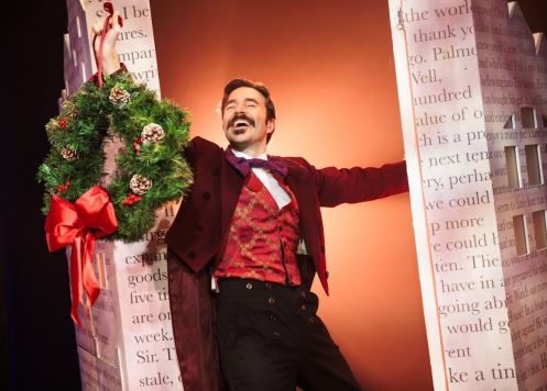 The set is deceptively simple but strikingly evocative. The stage is bordered with Huntley and Palmer biscuit labels, grounding the production unmistakably in its Reading setting. Behind the actors, the skyline is plastered with strips of Dickens’s original text, a visual nod to the story’s origins and a clever suggestion that Scrooge’s path is, at least initially, already written. The interplay between the industrial and the literary worlds creates a frame that feels both nostalgic and inventive.