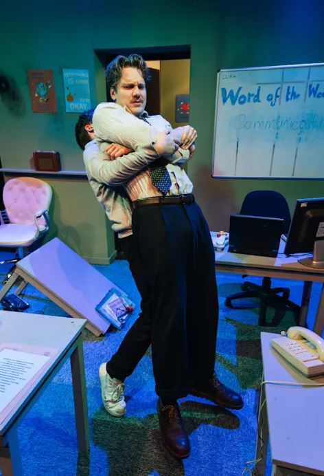 The acting space of the Studio is small, but is effectively used without seeming oppressive, and shows all the idiosyncrasies of the office environment. It somehow reflects the personalities of its Tuesday night occupants. The gas masks on the hooks are chilling, and the dry ice is effective in creating atmosphere, enhancing the ambiance of the appropriate lighting designed by Rich Evans. The posters that fall down and are then put up again tell us an awful lot, and the stagehands clad in anti-radiation garb make a powerful statement. Moreover, the sound design by Nick Wells takes us smoothly into their world.