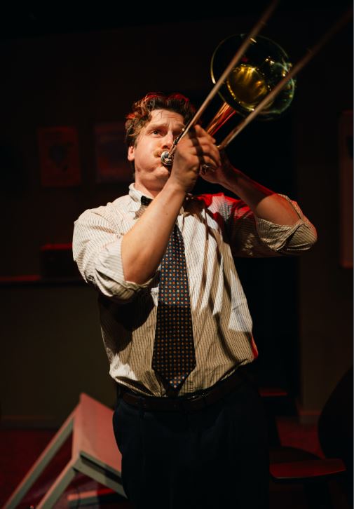 As Jon, Sam Moore gives a first impression of Jon being bitter and edgy, but it is he who carries the most humorous lines. It’s not exactly light relief but the coal black humour is swiftly delivered … plus admirable trombone playing, for which a well-deserved round of applause was apt. Morre’s Jon has a laugh-or-cry presence and is a powerful force.