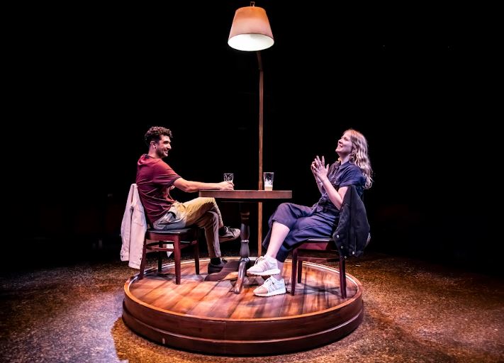 The staging of Strategic Love Play immediately plays a strong hand and invites the audience to study the awkwardness of first date realities in 2023 from a full 360 degrees. Much like a world filled with multitudes of algorithms attempting to match and pair couples, we analyse the habits, reactions, and subtleties of sentences of the two characters – here named simply as ‘Man’ and ‘Woman’ – around which the play’s narrative quite literally revolves.